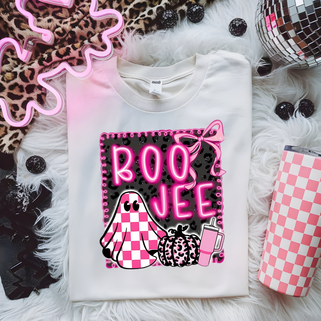 Show off your spooky style with our BOO JEE Halloween shirt! Featuring a pink neon ghost, leopard background, checkered pumpkin, and iced coffee cup, this fun and sassy tee is perfect for October vibes.