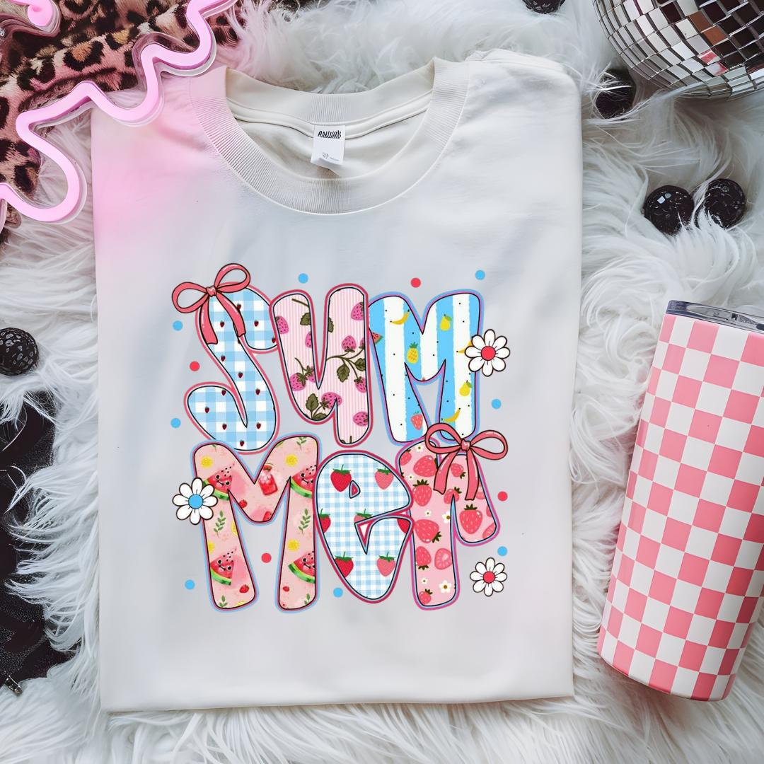 Bring the sunshine with you wherever you go in this adorable Summer graphic tee! Each bold letter bursts with a different cheerful pattern—gingham, strawberries, watermelon, polka dots, and more—finished with playful bows and daisies. Perfect for beach days, picnics, or just soaking up the season, this soft and comfy shirt is a must-have for your warm-weather wardrobe.