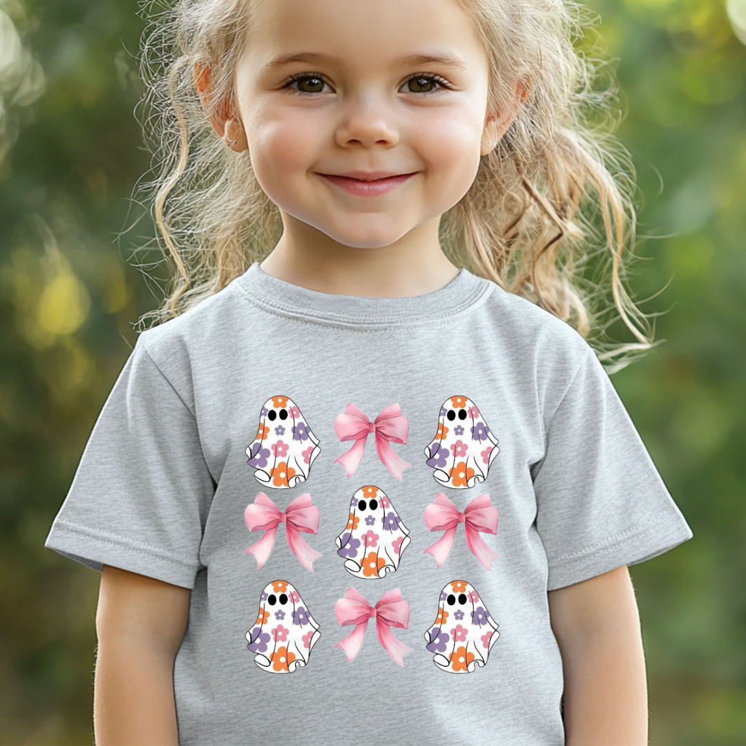 Adorable ghosts, pretty bows, and a whole lot of charm — this spooky-sweet kids tee is perfect for fall fun.