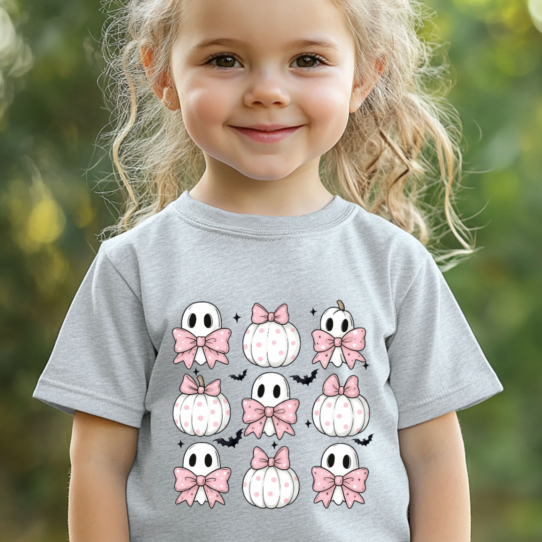 Adorable ghosts, pretty bows, and a whole lot of charm — this spooky-sweet kids tee is perfect for fall fun.