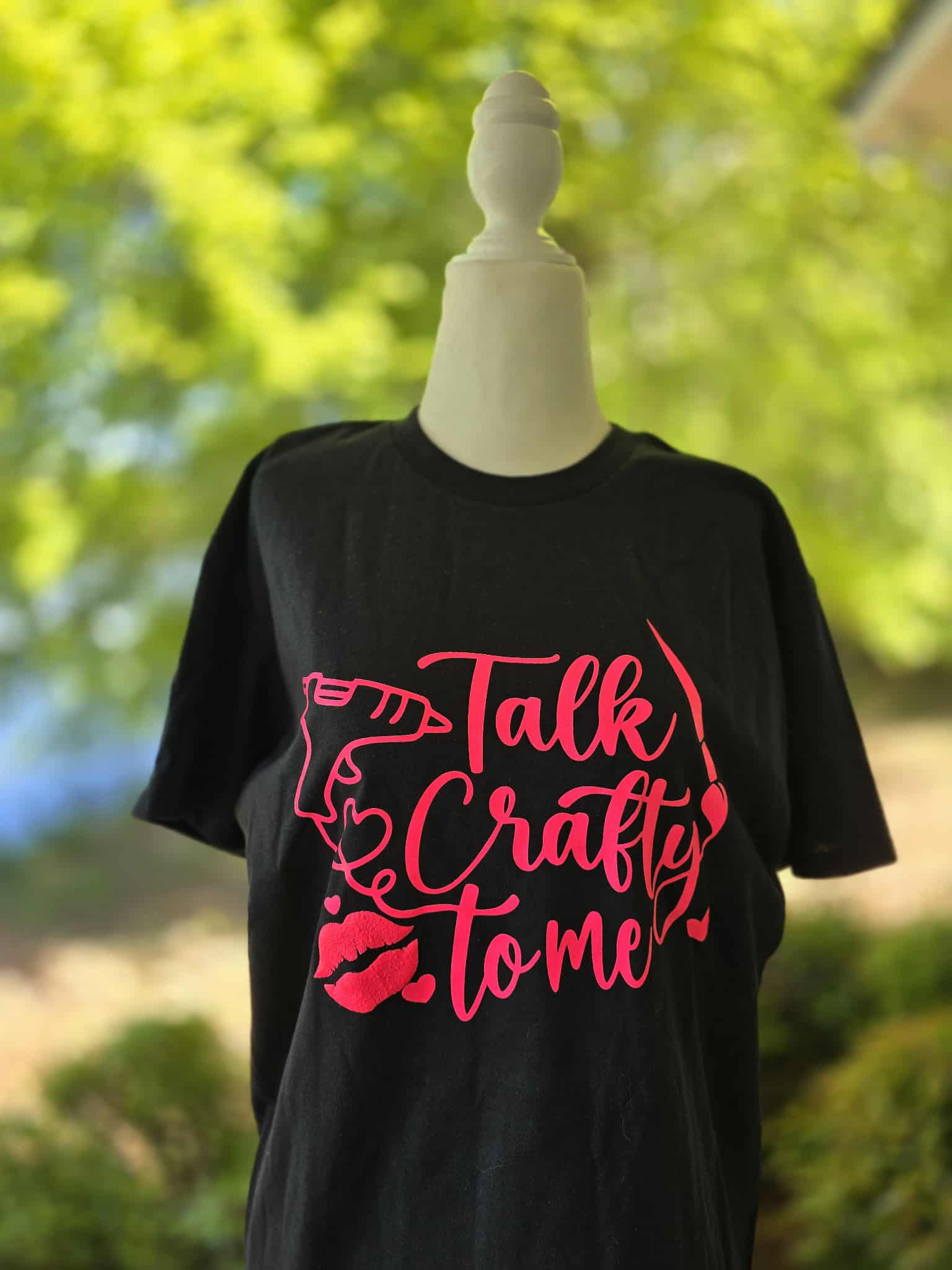 Get ready to turn heads and spark conversations with our Talk Crafty to Me tee! This bold black rt features vibrant hot pink lettering that pops- and the real showstopper? A pair of fabulous puffed lips that add texture, attitude, and a whole lot of sass.