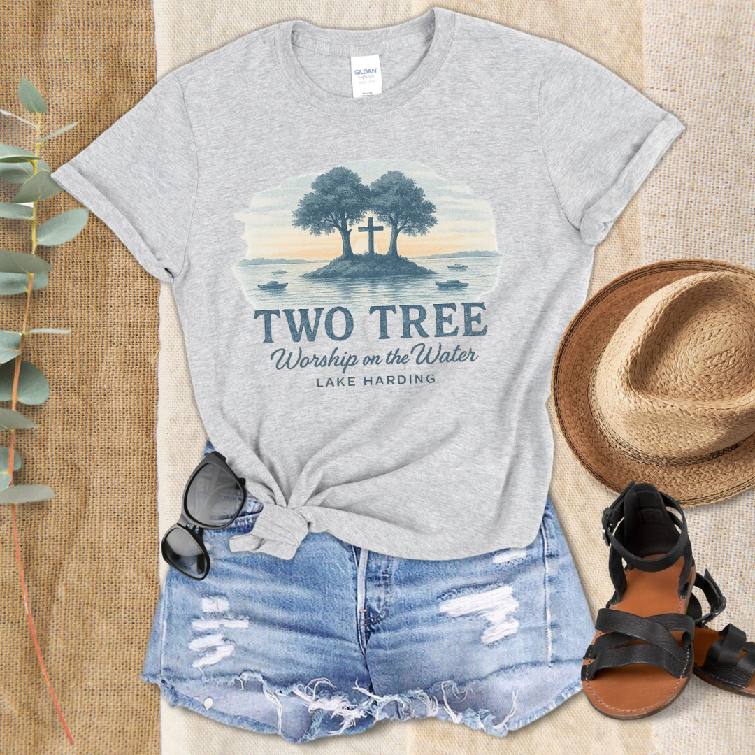 Celebrate faith, fellowship, and the beauty of Lake Harding with this “Two Tree – Worship on the Water” t-shirt. Featuring a serene illustration of the iconic Two Tree island with its cross standing tall between the trees, this tee captures the peaceful spirit of lakeside worship. Perfect for church events, summer gatherings, or as a keepsake for anyone who’s experienced Worship on the Water. Soft, breathable, and made for comfort, it’s a wearable reminder of God’s creation and community.